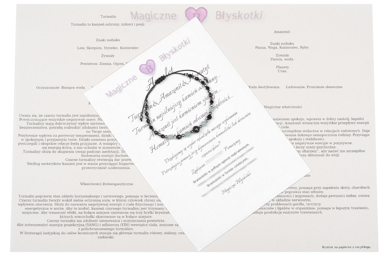 W komplecie otrzymujesz: bransoletkę, opis kamieni i kopertę jako opakowanie, co czyni ten zestaw unikalnym upominkiem.