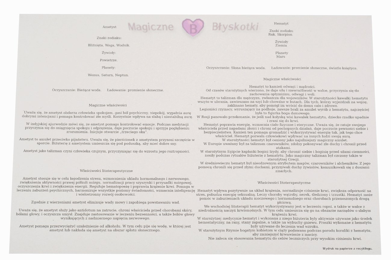 W komplecie otrzymujesz: bransoletkę, opis kamieni i kopertę jako opakowanie, co czyni ten zestaw unikalnym upominkiem.