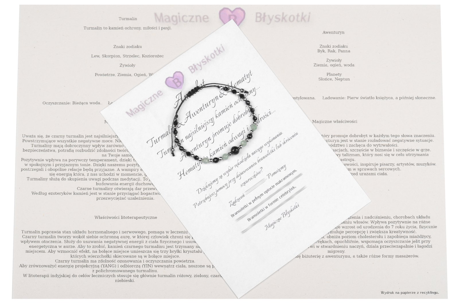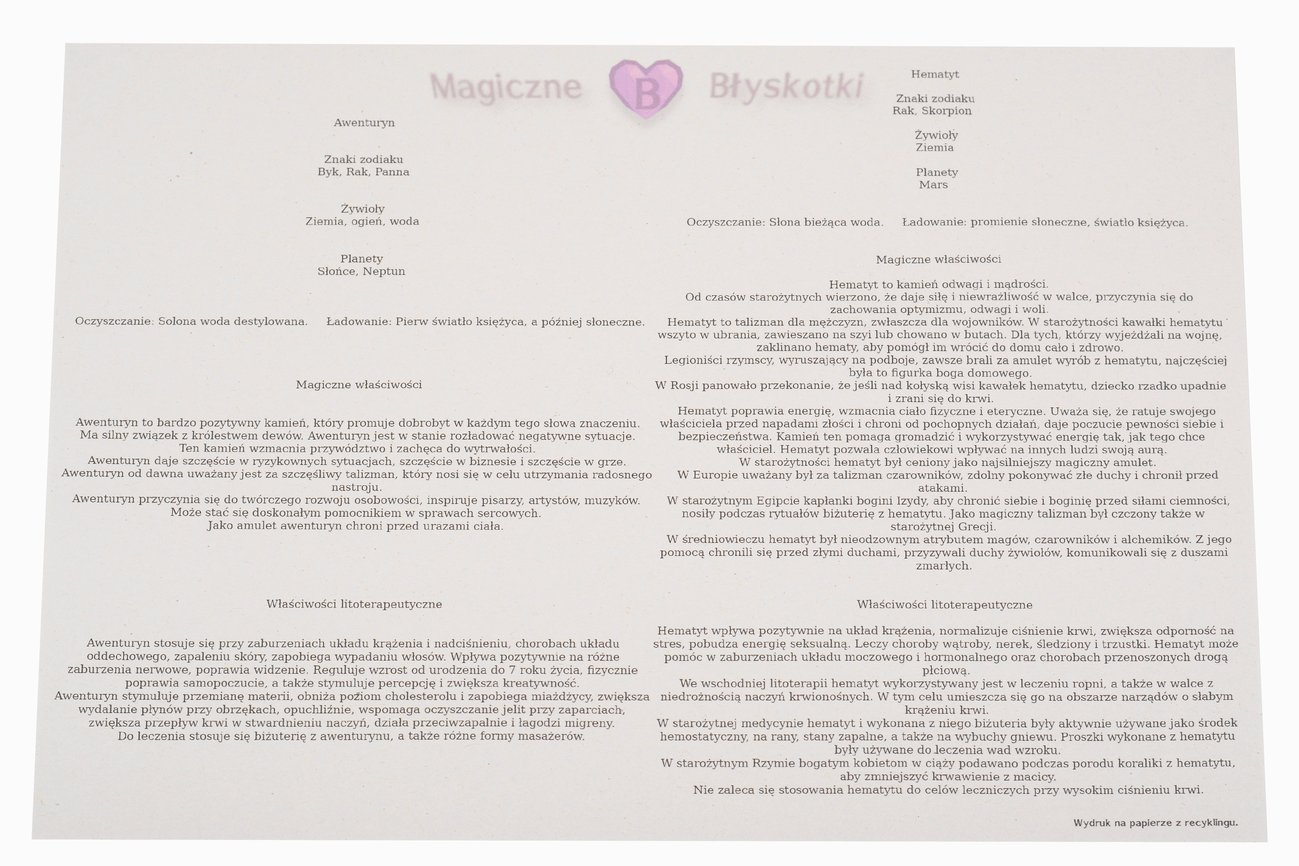 W komplecie otrzymujesz: bransoletkę, opis kamieni i kopertę jako opakowanie, co czyni ten zestaw unikalnym upominkiem.