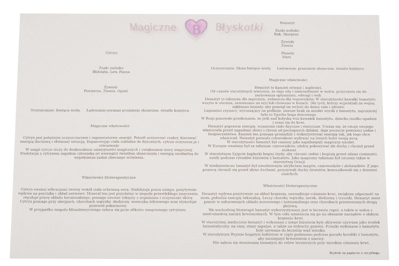 W komplecie otrzymujesz: bransoletkę, opis kamieni i kopertę jako opakowanie, co czyni ten zestaw unikalnym upominkiem.