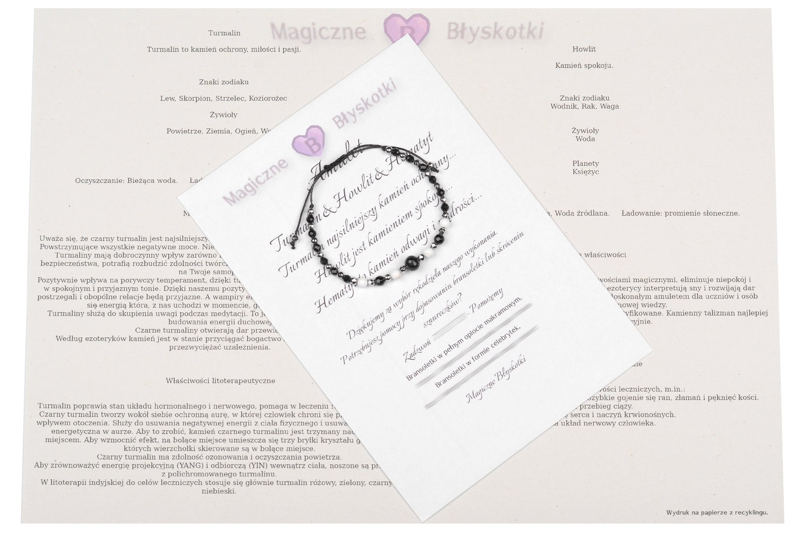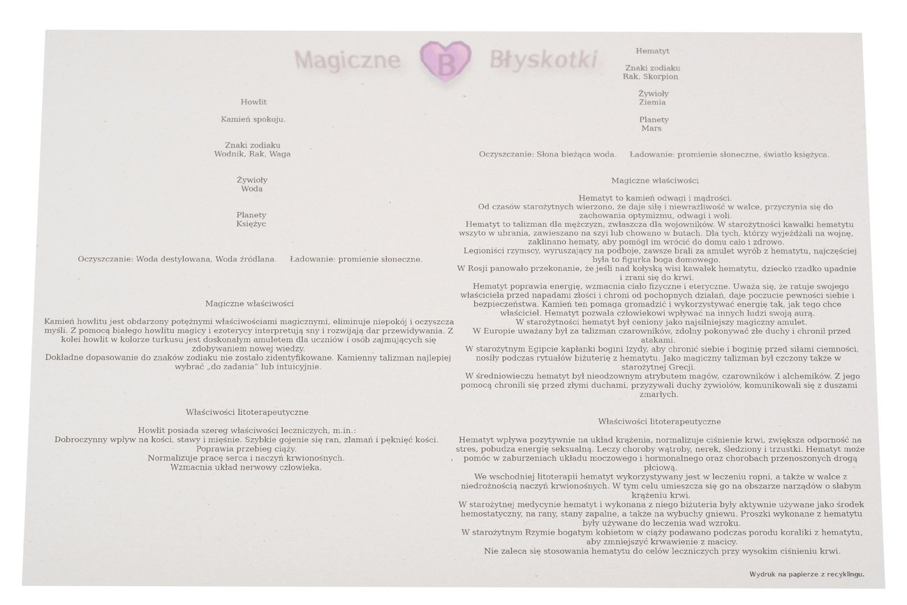 W komplecie otrzymujesz: bransoletkę, opis kamieni i kopertę jako opakowanie, co czyni ten zestaw unikalnym upominkiem.