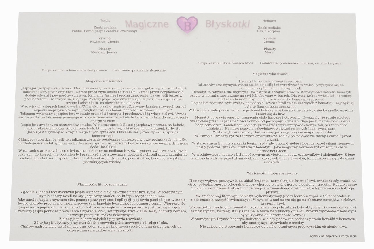 W komplecie otrzymujesz: bransoletkę, opis kamieni i kopertę jako opakowanie, co czyni ten zestaw unikalnym upominkiem.