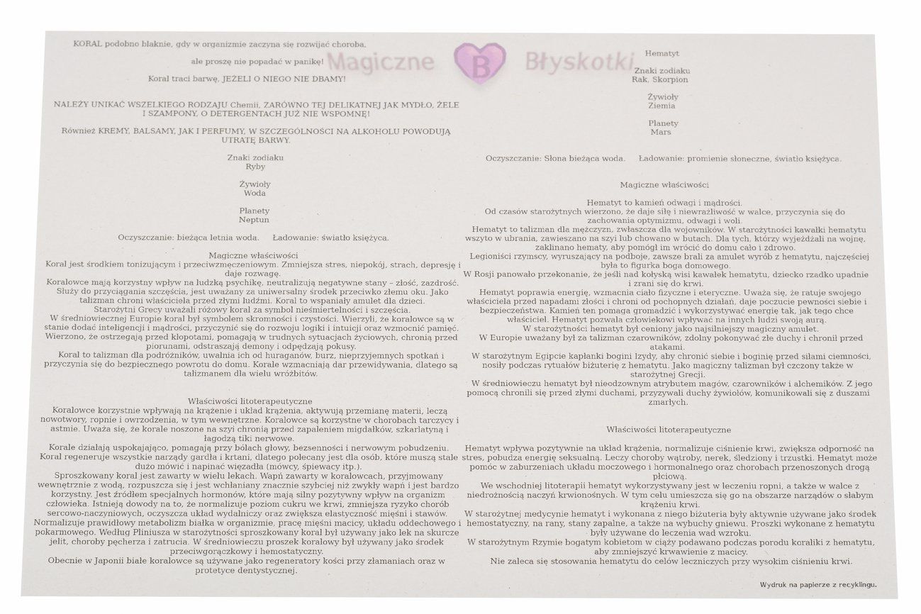 W komplecie otrzymujesz: bransoletkę, opis kamieni i kopertę jako opakowanie, co czyni ten zestaw unikalnym upominkiem.