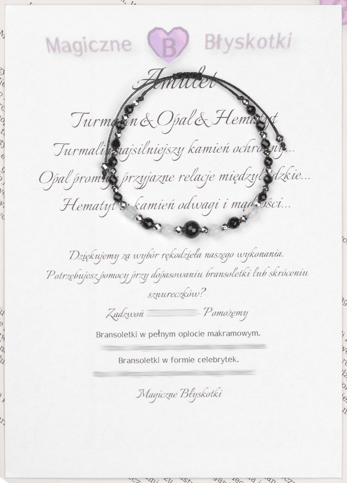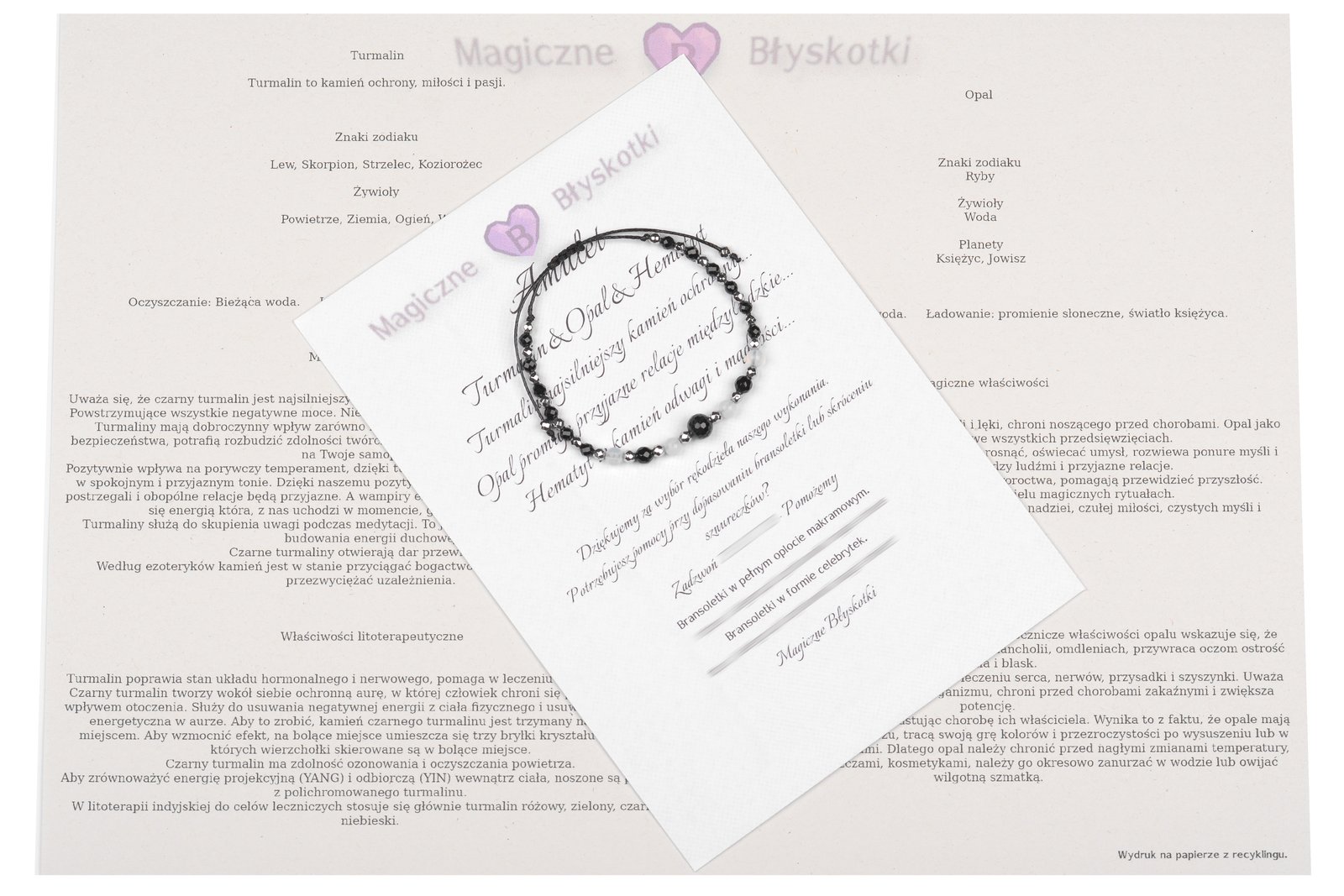 W komplecie otrzymujesz: bransoletkę, opis kamieni i kopertę jako opakowanie, co czyni ten zestaw unikalnym upominkiem.