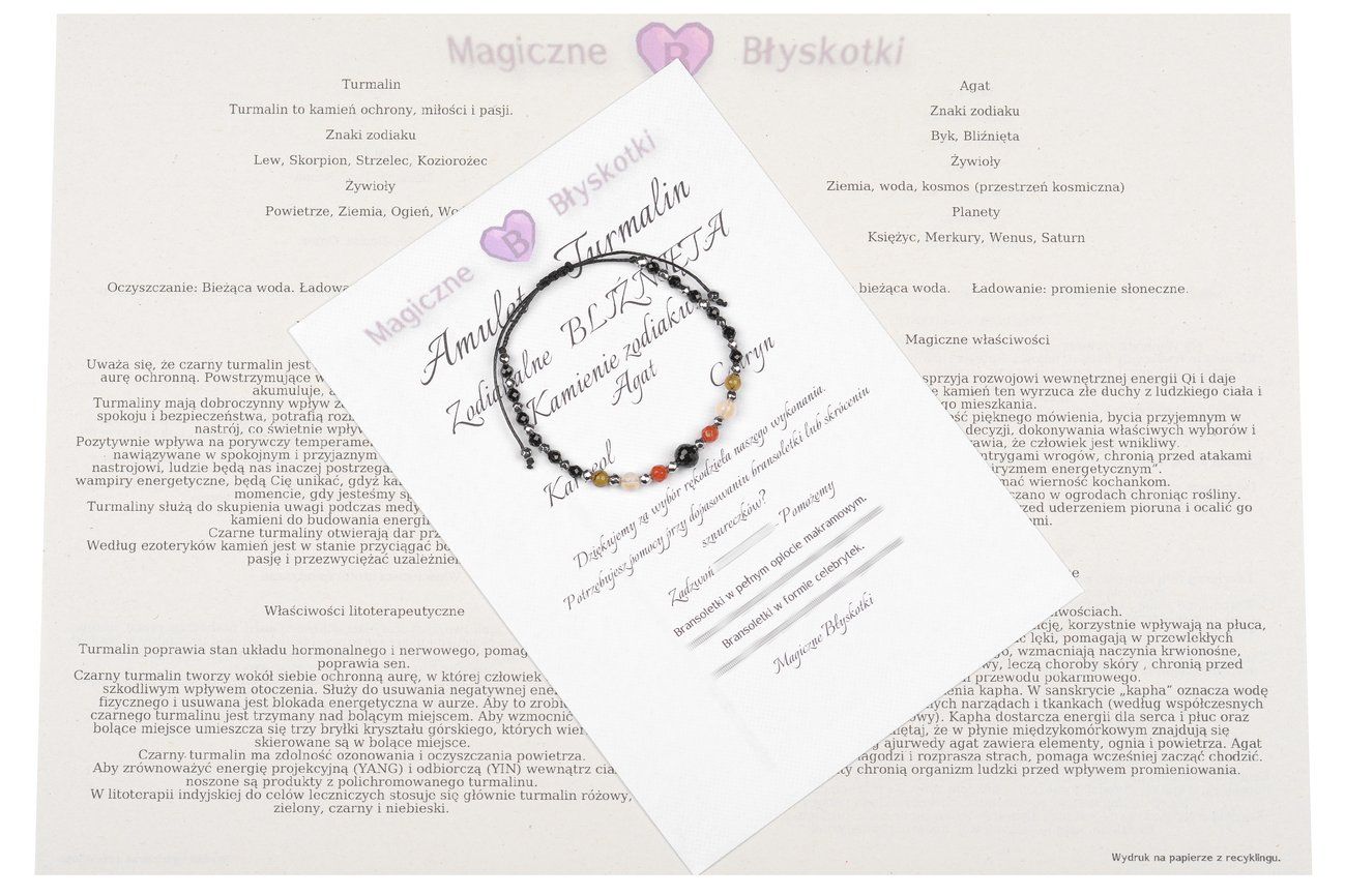Bransoletka delikatna i lekka, elegancka i subtelna. Centralnym elementem jest TURMALIN czarny fasetowany, po bokach kamienie zodiakalne i po sześć fasetowanych turmalinów. Jako przekładki, użyte zostały hematytowe platerowane kuleczki fasetowane.