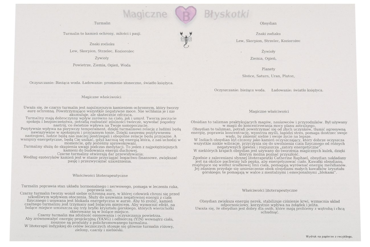 Turmalin, Obsydian śnieżny, Granat, Hematyt.