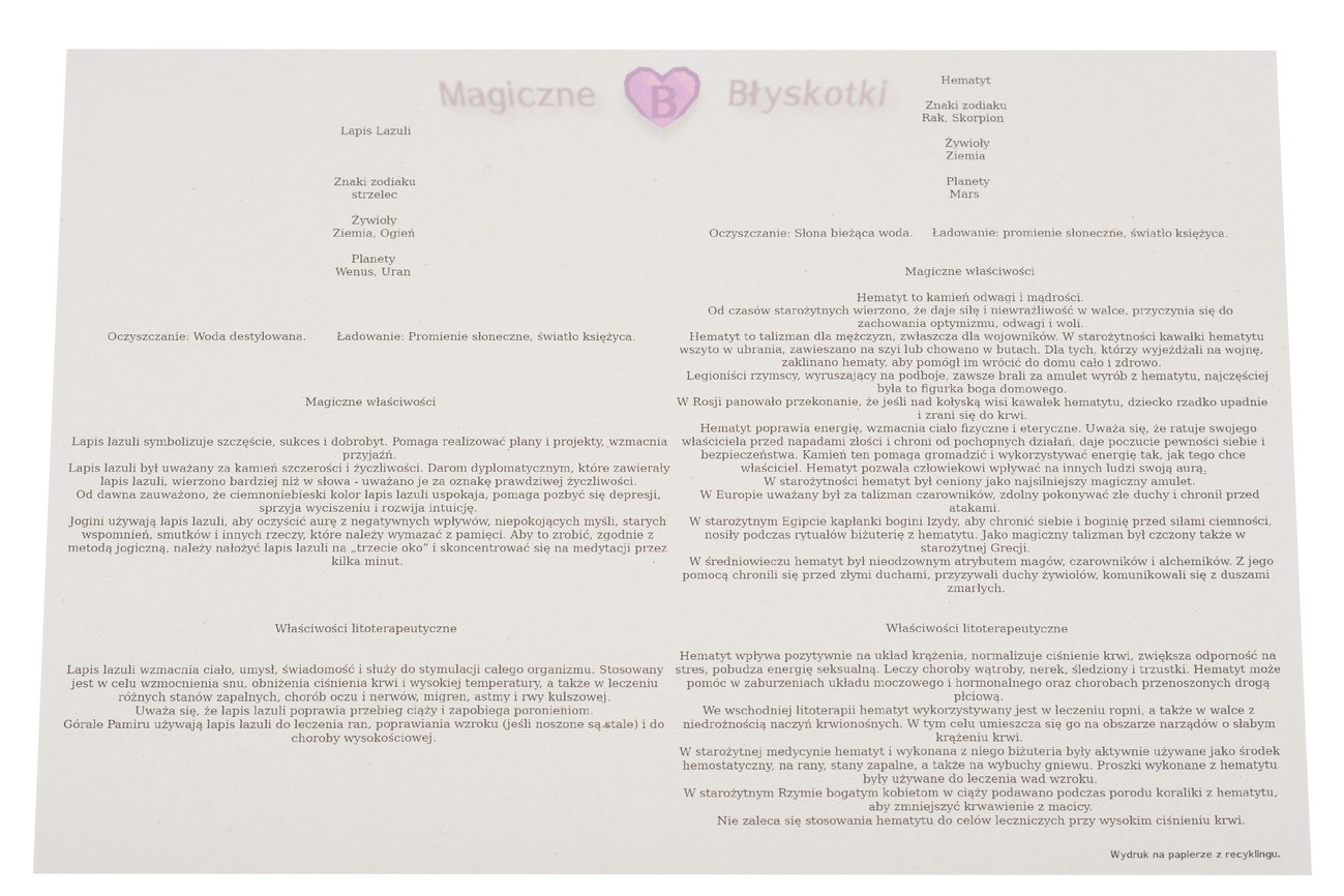 W komplecie otrzymujesz: bransoletkę, opis kamieni i kopertę jako opakowanie, co czyni ten zestaw unikalnym upominkiem.
